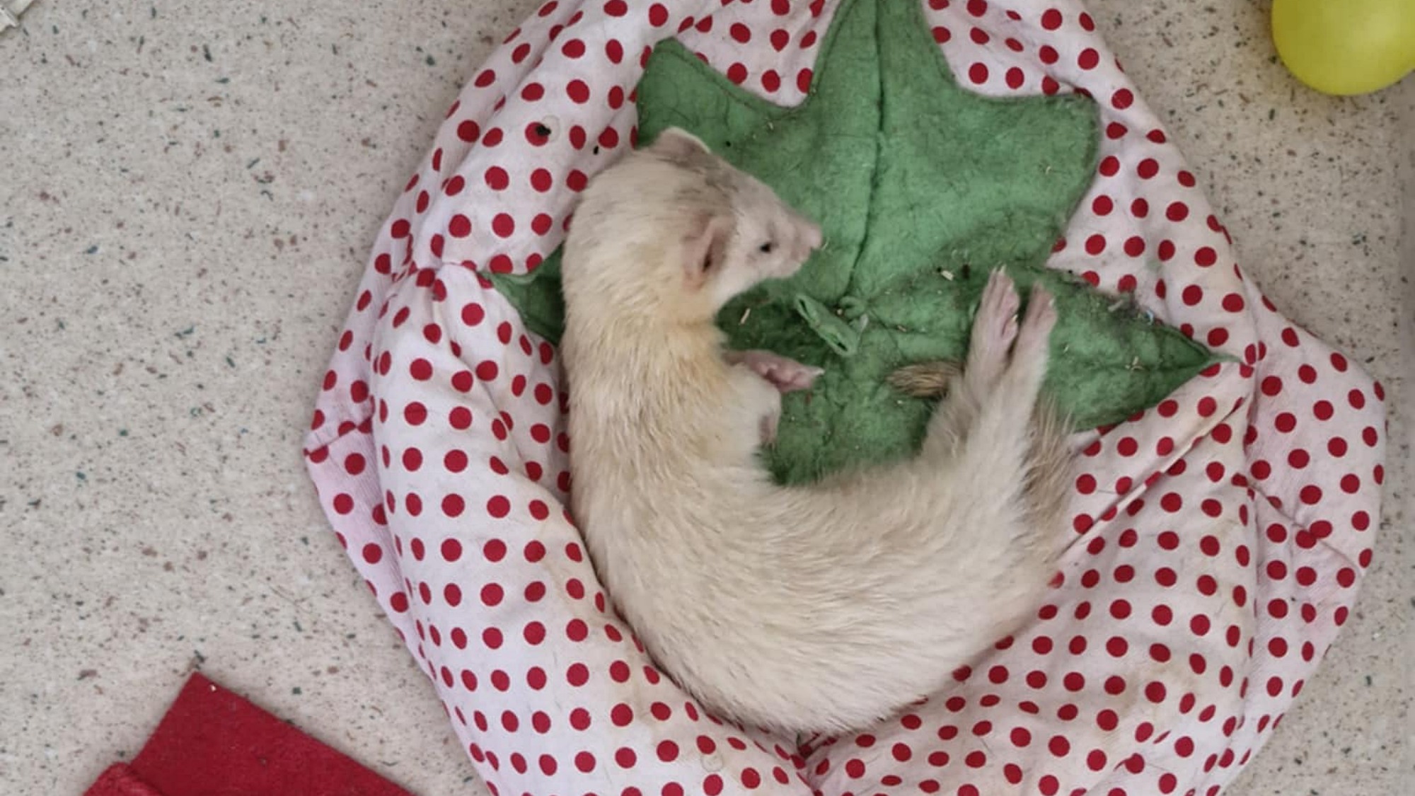 Du haut de ses cinq ans, elle est calme, câline et proche de l’homme. Elle sait retenir ses morsures lors du jeu, tolère très bien les autres furets, mais n’est pas la plus sympa avec le chat de sa famille d’accueil…